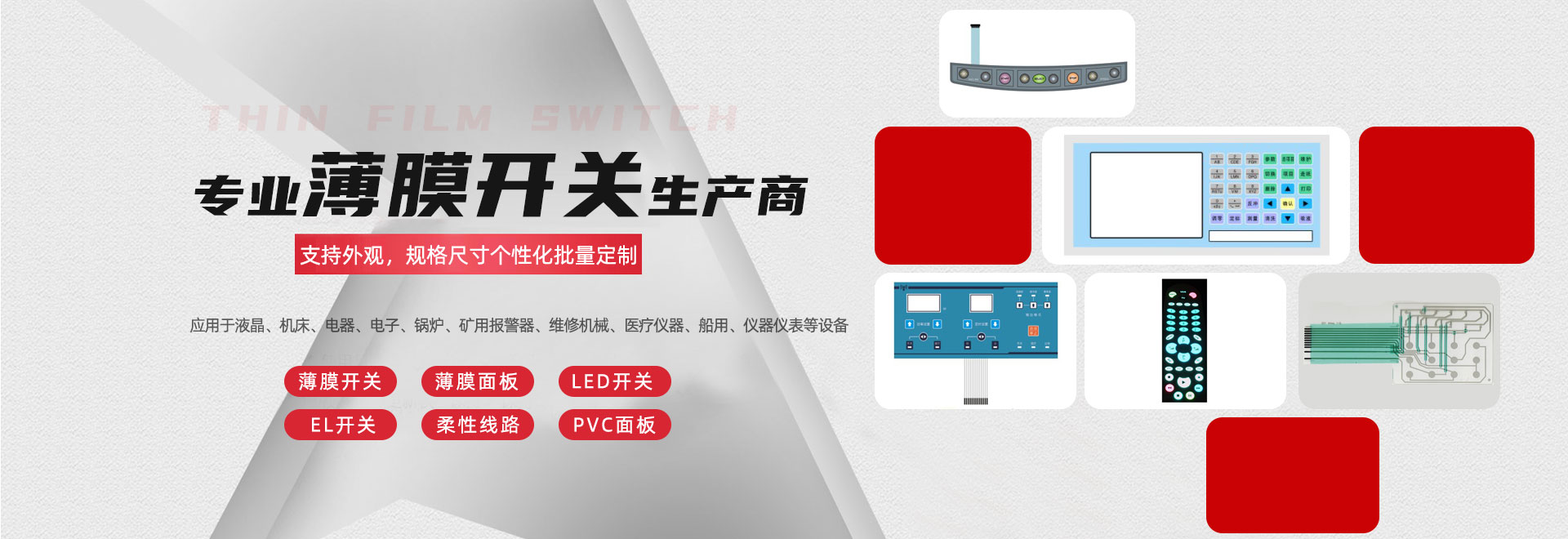 專業(yè)生產(chǎn)各種電子薄膜開關(guān);LED燈開關(guān)、PET/PC/PVC面板等電子配件。廣泛應(yīng)用于多個(gè)行業(yè)。